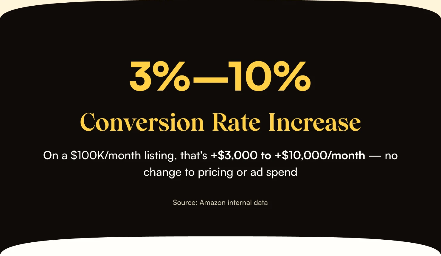 According to Amazon's data, A+ Content that is well-executed can increase the conversion rates anywhere from 3 to 10%. If a listing generates $100,000 per month, that means an extra $3,000 to $10,000 in monthly revenue, without making any price change or ad spend.