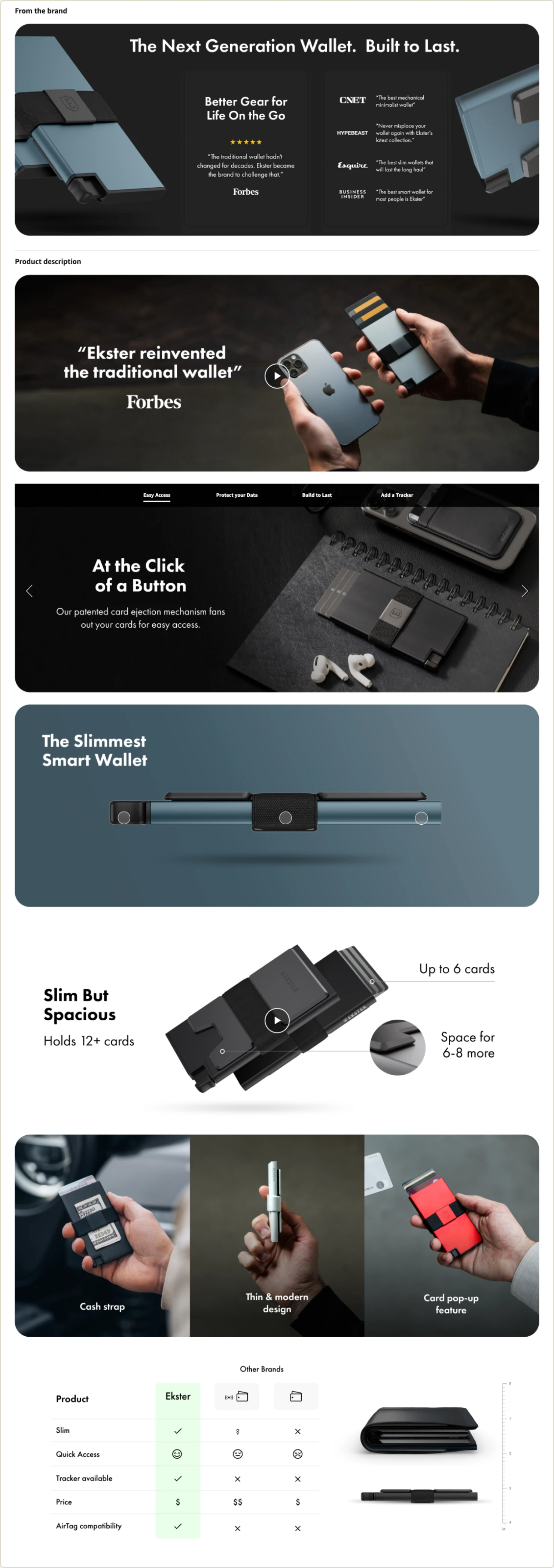 Before we launched a single campaign for Ekster, we carefully built every element of their Amazon presence, including A+ content that reflected their DTC-level design aesthetic, RFID protection messaging, and premium lifestyle imagery.
