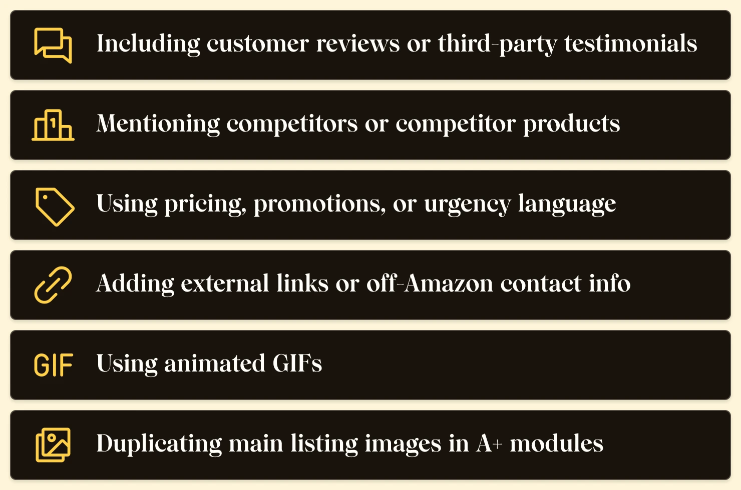 What gets A+ Content rejected includes customer reviews from third parties, GIFs, products that mention competitors by name, promotional language and phrases that mention any discounts, or links to external websites.