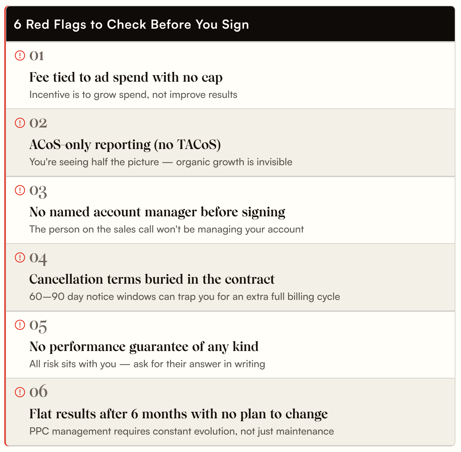 Before you sign with any Amazon PPC agency, it’s important to be careful and to check for these signals. Each of these is worth a direct conversation.