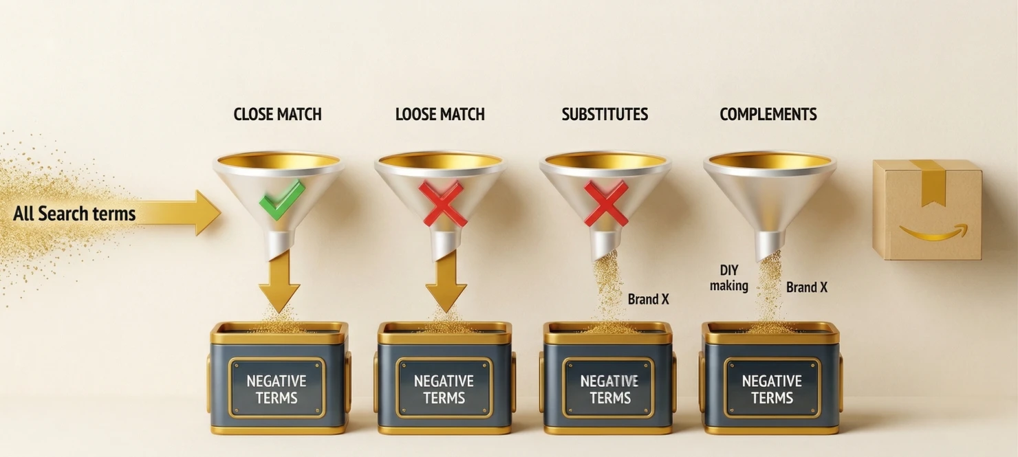 Amazon's automatic campaigns use four targeting types: Close Match, Loose Match, Substitutes, and Complements, each with different relevance levels. Loose Match and Substitutes often cast the widest net, generating the most irrelevant traffic.