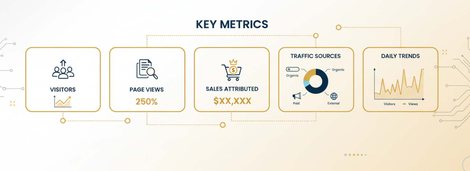 Daily Visitors and Views: Trend lines showing traffic patterns over time. Look for spikes that correlate with promotions or external campaigns, and identify slow days where an additional marketing push might help.
