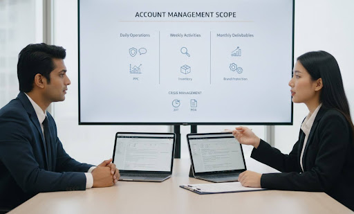 Some sellers benefit from combining internal operational management with external marketing expertise, or vice versa. Full-service account management agencies offer both capabilities under one roof, eliminating coordination challenges between separate partners.