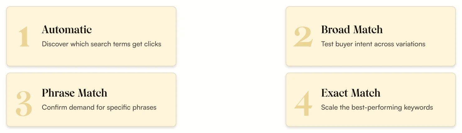 - Exact match campaigns to scale the best-performing keywords