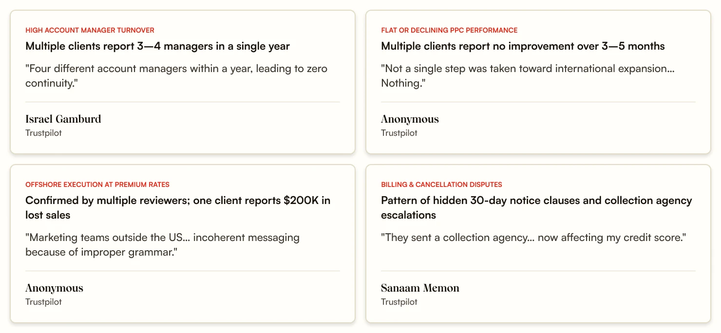The negative reviews on Trustpilot show that there’s a pattern of high account manager turnover, offshore reliance at a premium price, billing and cancellation disputes, and declining PPC performance. For example, Ground-based Nutrition had reported issues with declining performance and billing on Truspilot, while Sanaam Memon, who runs a footwear brand, specifically had an issue with cancellation. Israel Gamburd is another Amazon seller who complained about performance, but, in his case, he attributed it to high account manager turnover.