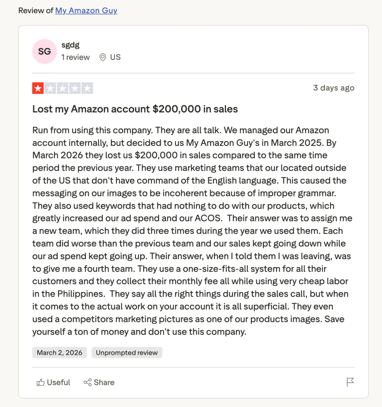 Multiple clients have reported working with between three to four different account managers within a single year. The problem with high account manager turnover is that strategic context, brand knowledge, and momentum get lost at each handoff, as one recent client explains in his My Amazon Guy review on Trustpilot: