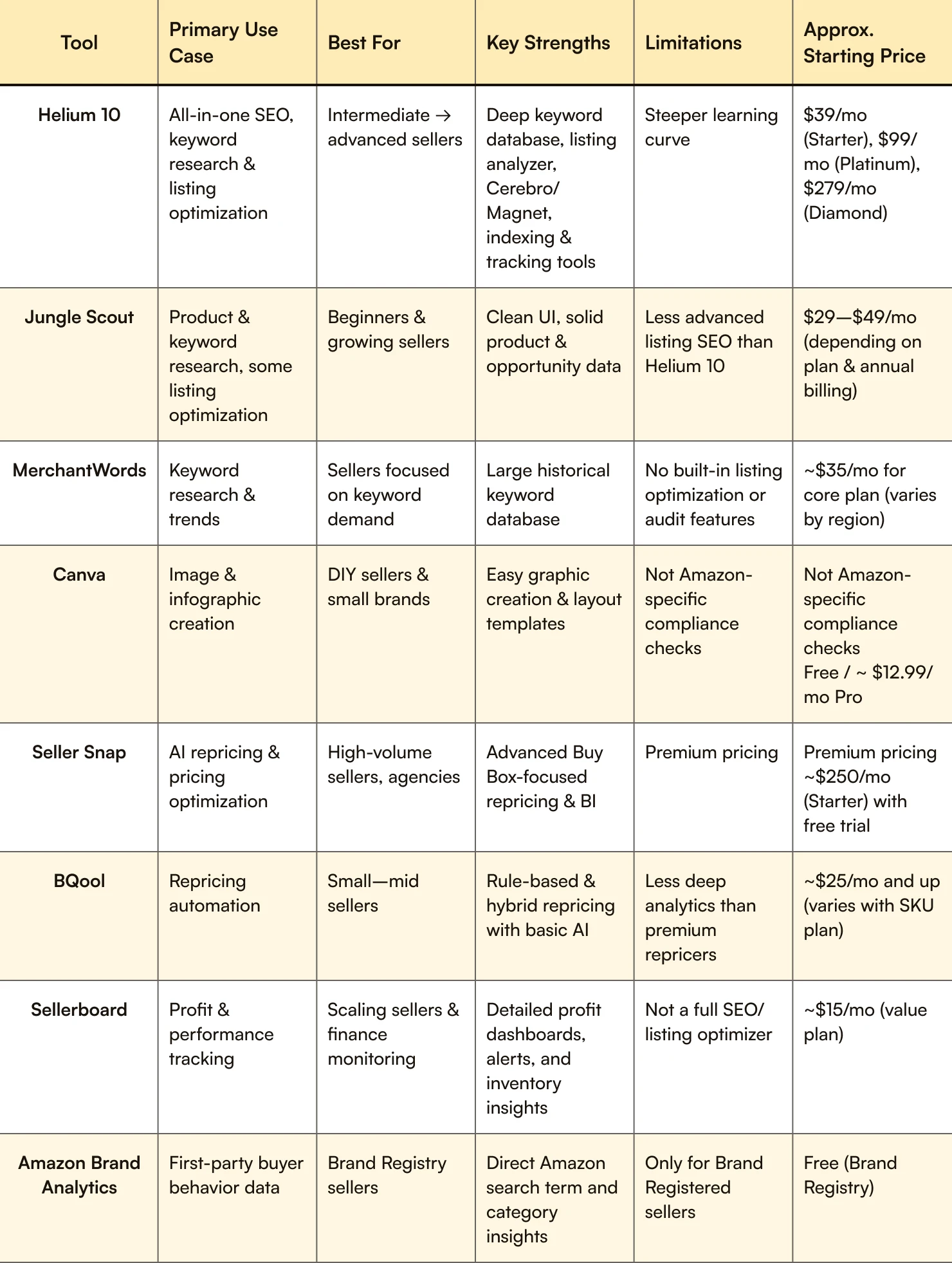 The goal here is simple: help you decide which tools are actually worth using for Amazon listing optimization and which ones you can safely skip. The comparison below focuses on real-world usability, accuracy, and ROI, not marketing hype.