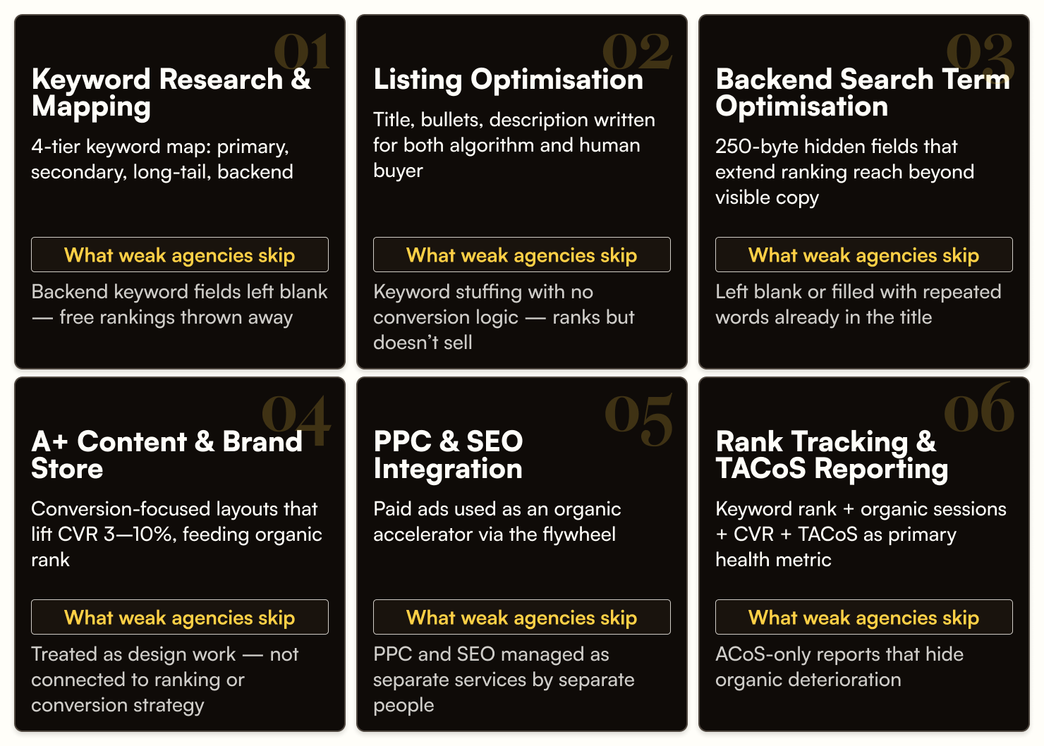 This includes keyword research, writing and fixing product listings (titles, bullets, descriptions), filling in backend keyword fields, building A+ Content and Brand Stores, connecting PPC to organic rank, and tracking performance over time.