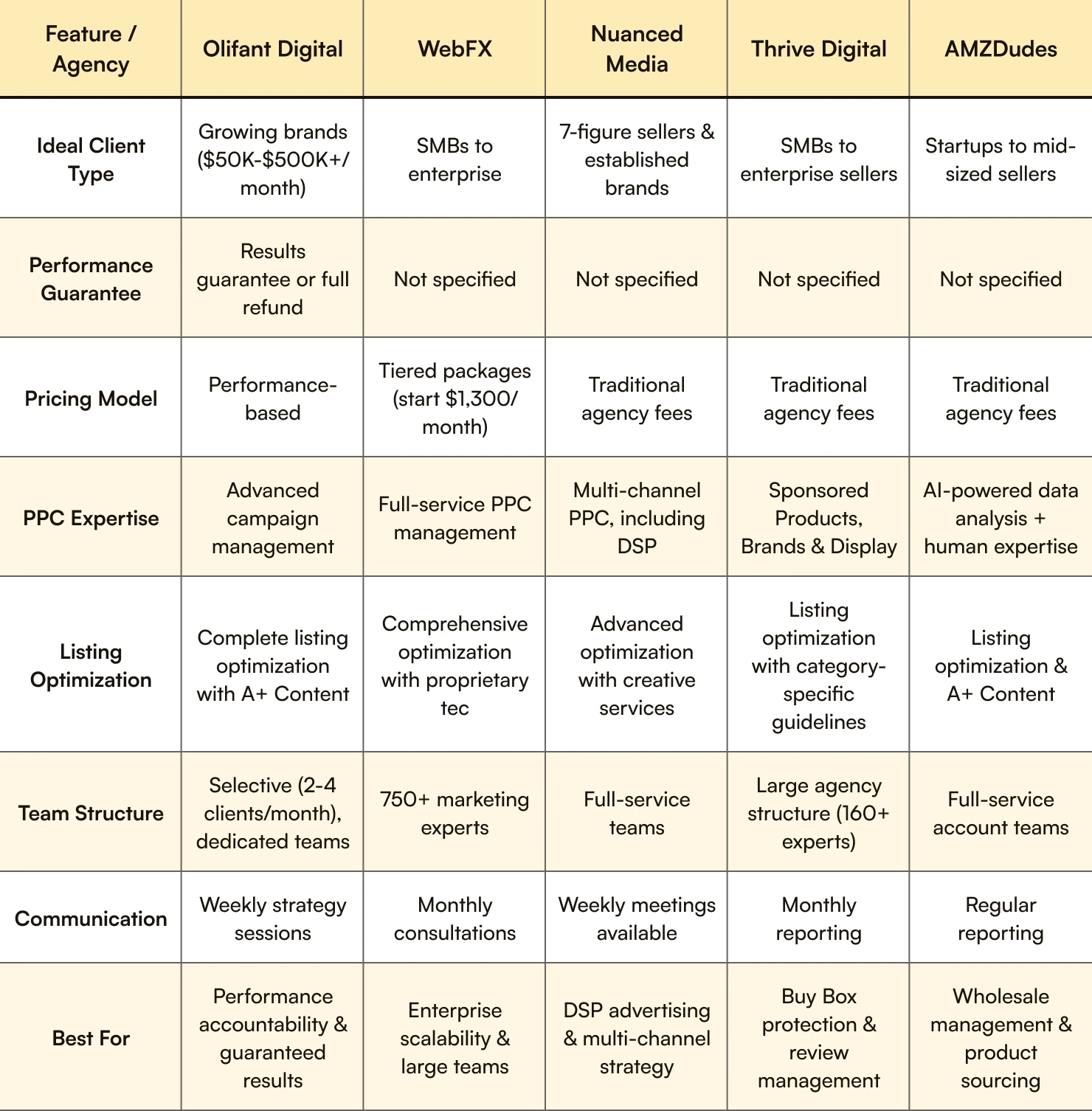 Here's a detailed comparison of how leading agencies stack up on the capabilities that directly impact Amazon's growth and profitability.