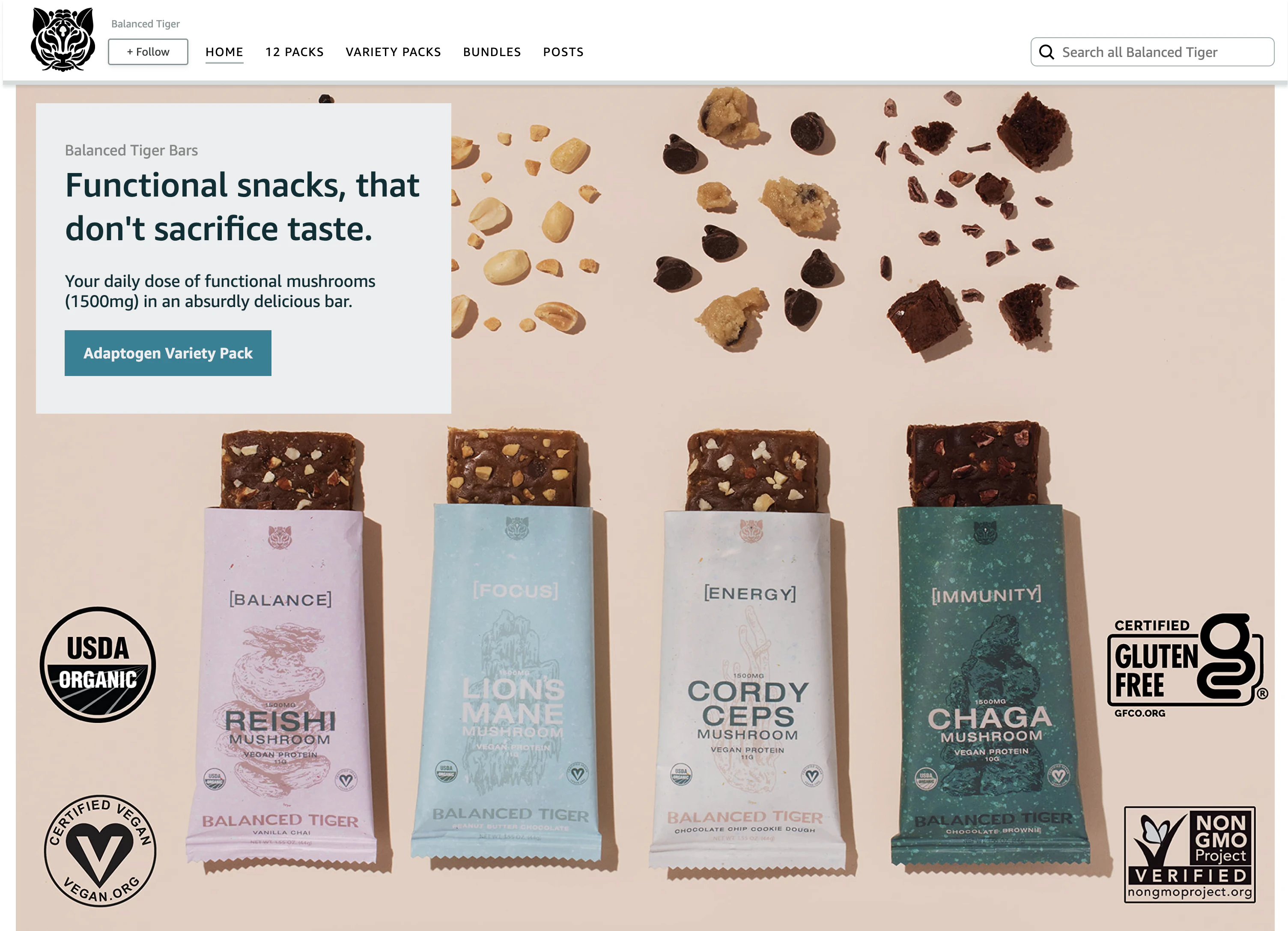 USDA organic and crafted with transparency, Balanced Tiger makes it easy to enjoy a convenient, nutrient-dense snack that delivers the everyday benefits of mushrooms in a delicious, accessible way.